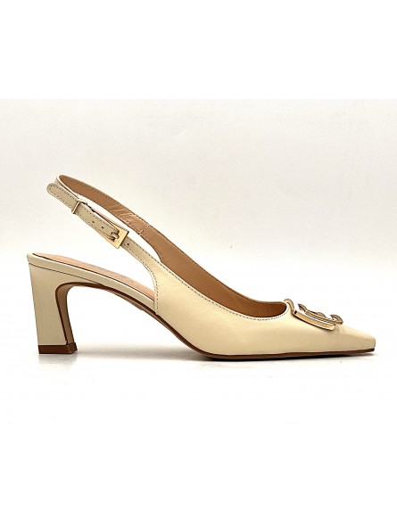 Escarpin Stocks Permanents Rachel en cuir beige . Escarpin découpé avec bride arrière . Elégant et facile avec son talon de 6,5 centimètres , se porte aussi bien en soirée ou en journée .