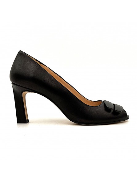 Escarpin Stocks Permanents Rosana en cuir noir . Très élégant avec sa boucle , il se porte aussi bien en journée que en soirée où il sublimera vos plus belles tenues avec son talon de 7,5 centimètres .