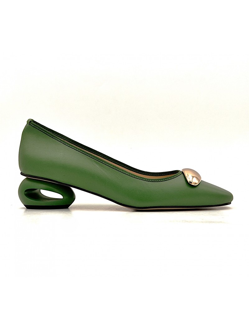 Escarpin Stocks Permanents Ruth en cuir vert . Original avec son talon ajouré .