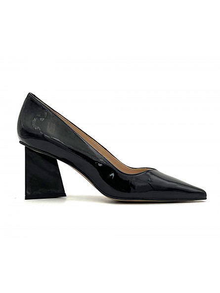 Escarpin Stocks Permanents Valy en cuir noir vernis . Escarpin très Elégant et original avec son talon triangulaire de 7 centimètres .