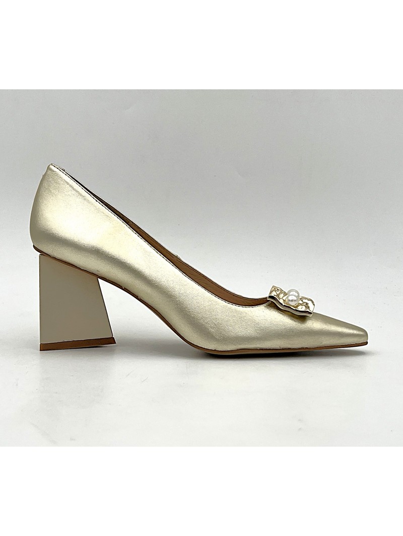 Escarpin Stocks Permanents Vida en cuir lamé or . Escarpin habillé qui sublimera vos plus belles tenues . Son talon de 7 centimètres triangulaire original et particulièrement stable vous accompagne tout en confort pour toute la soirée .