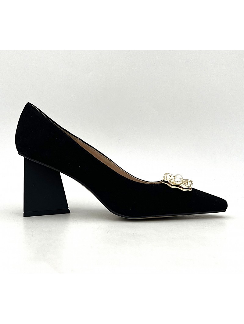 Escarpin Stocks Permanents Vida en daim noir . Escarpin habillé qui sublimera vos plus belles tenues . Son talon de 7 centimètres triangulaire original et particulièrement stable vous accompagne tout en confort pour toute la soirée .