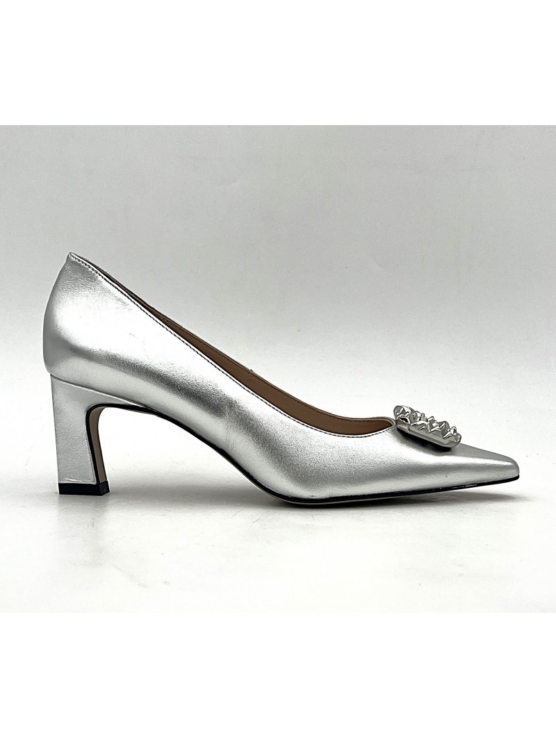 Escarpin Stocks Permanents Roseta en cuir lamé argent . Escarpin très Elégant et facile avec son talon de 6,5 centimètres .