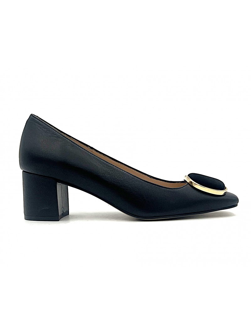 Escarpin Stocks Permanents Venus en cuir noir . Très élégant avec sa boucle métal et daim , il se porte aussi bien en journée que en soirée , toujours confort avec son demi talon de 5 centimètres et son bout carré large .