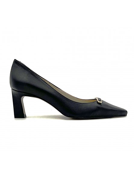 Escarpin Stocks Permanents Vega en cuir noir . Escarpin élégant et tendance , se porte aussi bien en soirée ou en journée . confortable avec son talon de 6 centimètres .