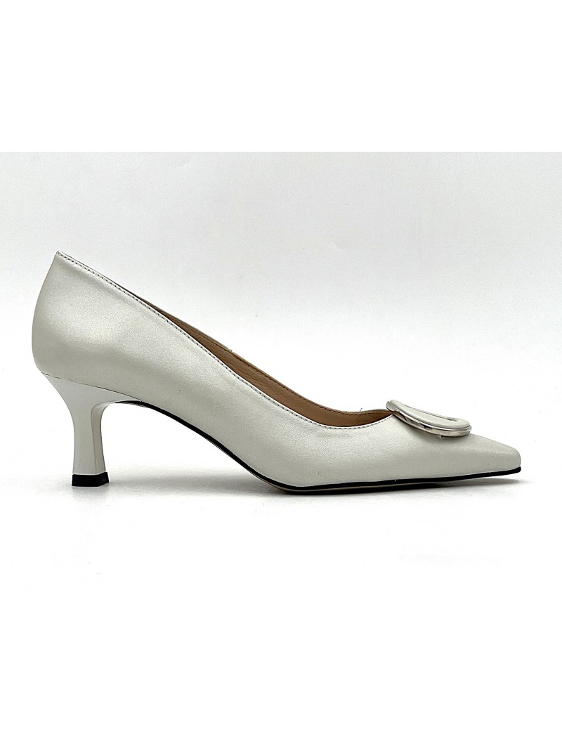 Escarpin Stocks Permanents Vera en cuir blanc nacré . Escarpin élégant avec sa boucle cuir et métal , il reste très confortable avec son talon de 5,5 centimètres .