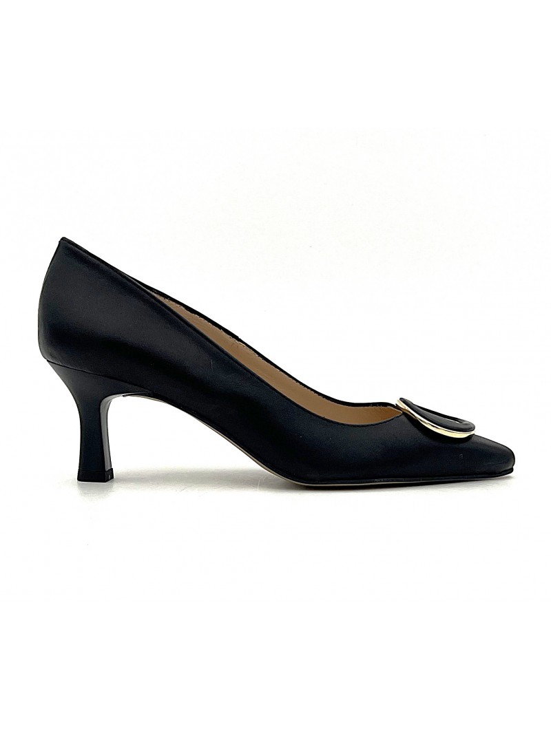 Escarpin Stocks Permanents Vera en cuir noir . Escarpin élégant avec sa boucle cuir et métal , il reste très confortable avec son talon de 5,5 centimètres .