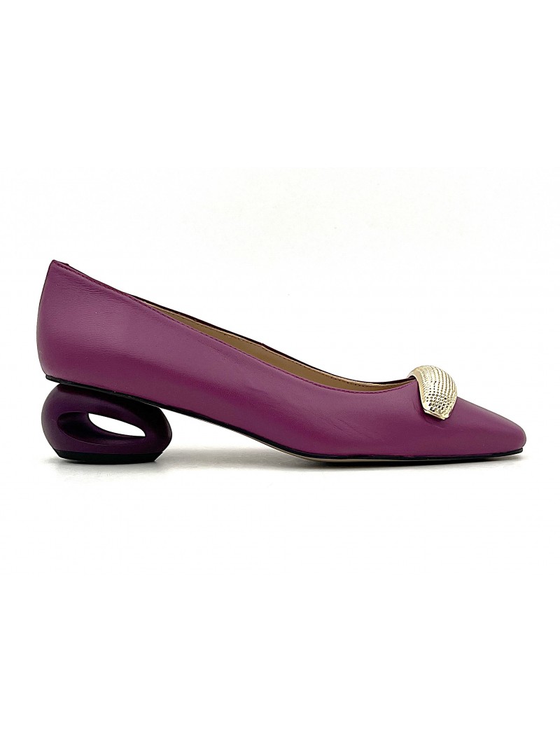 Escarpin Stocks Permanents Vivia en cuir aubergine . Original et élégant avec son talon ajouré et sa belle boucle métal .