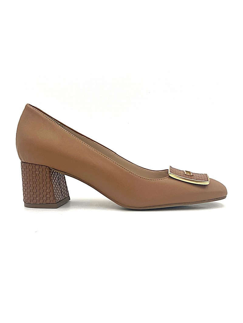 Escarpin Stocks Permanents Nisa en cuir camel . Très élégant avec sa boucle métal et cuir , il se porte aussi bien en journée que en soirée , toujours confort avec son demi talon de 5 centimètres .