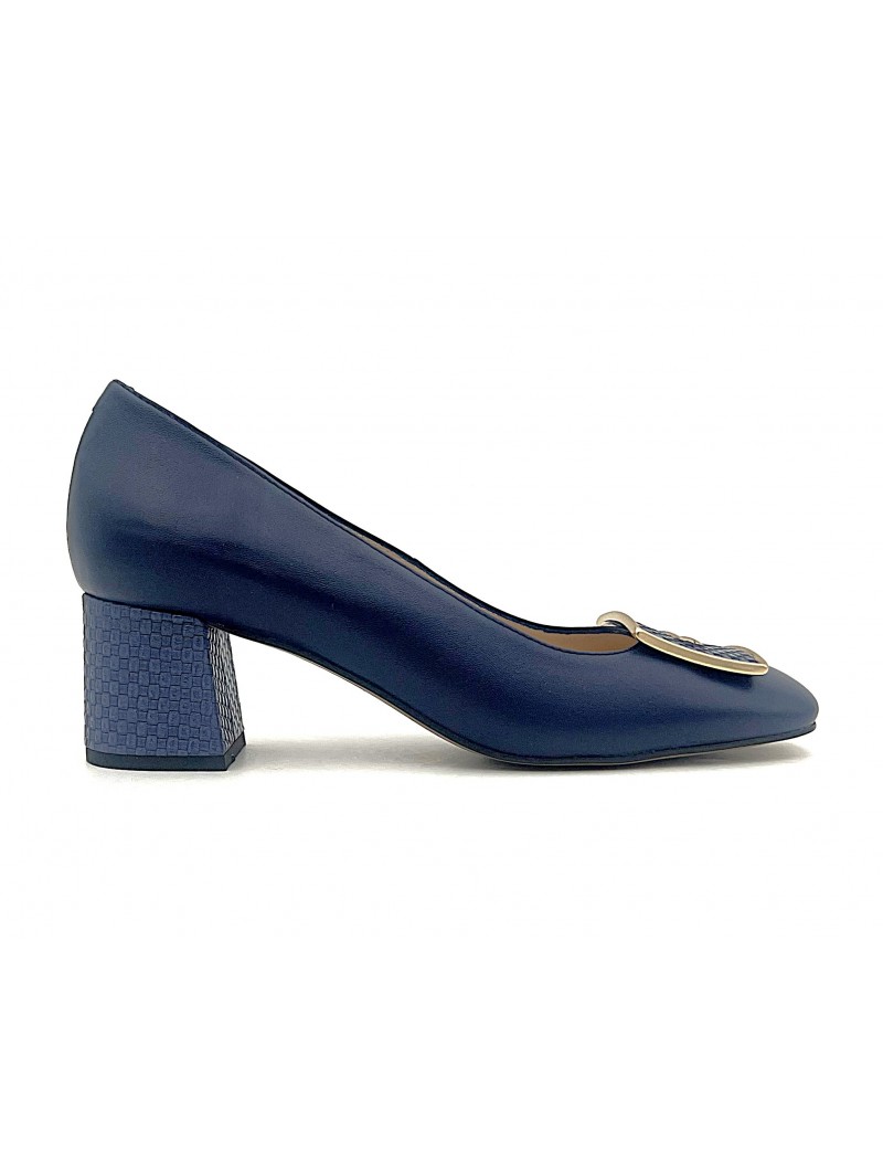 Escarpin Stocks Permanents Nisa en cuir marine . Très élégant avec sa boucle métal et cuir , il se porte aussi bien en journée que en soirée , toujours confort avec son demi talon de 5 centimètres .