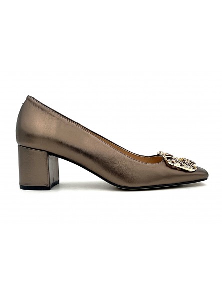 Escarpin Stocks Permanents Valda en cuir lamé bronze . Très élégant avec sa boucle métal , il se porte aussi bien en journée que en soirée , toujours confort avec son demi talon de 5 centimètres et son bout carré large .