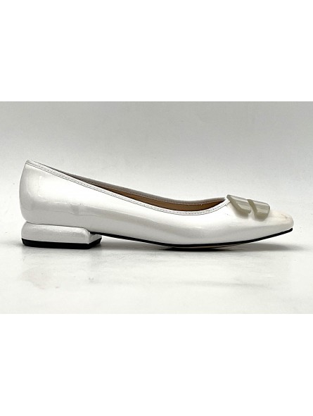 Ballerine Stocks Permanents Vila en cuir blanc nacré vernis . Elégante au quotidien avec son talon de deux centimètres et sa jolie boucle façon corne .