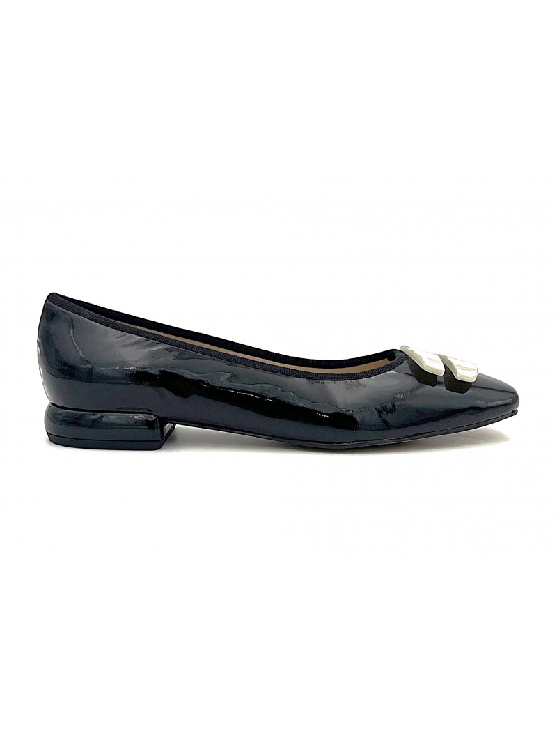 Ballerine Stocks Permanents Vila en cuir noir vernis . Elégante au quotidien avec son talon de deux centimètres et sa jolie boucle façon corne .