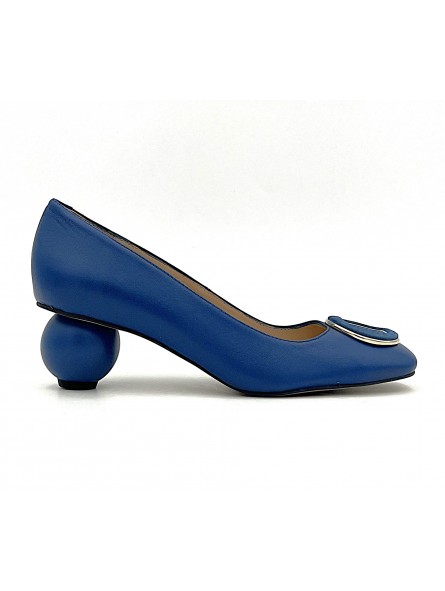 Escarpin Stocks Permanents Vania en cuir bleu pétrole . Très élégant avec sa boucle métal et daim , il se porte aussi bien en journée que en soirée , toujours confort et originale avec son demi talon boule de 5 centimètres .