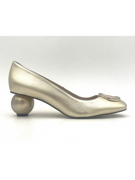 Escarpin Stocks Permanents Vania en cuir or . Très élégant avec sa boucle métal et daim , il se porte aussi bien en journée que en soirée , toujours confort et originale avec son demi talon boule de 5 centimètres .