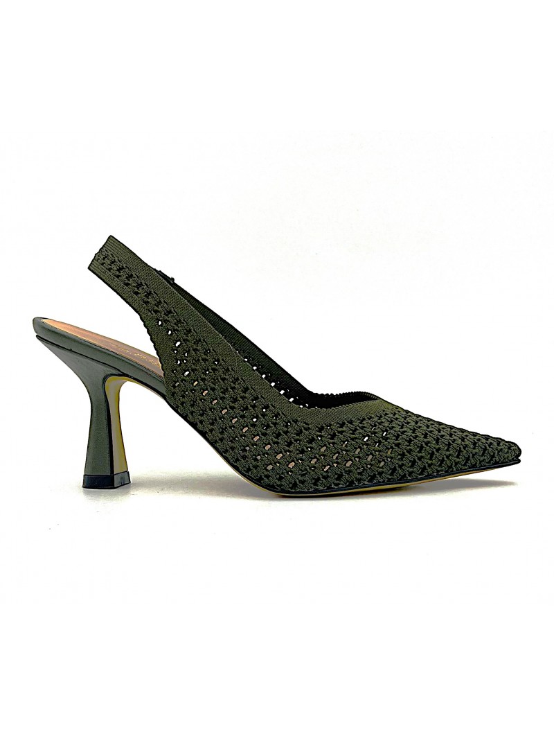 Escarpin découpé Nacrée Yara en textile tricoté kaki . Tendance et aéré l'escarpin Yara est particulièrement confortable grâce à son empeigne en trico très souple . Découpé au talon , il est parfait pour l'été et la demi saison .