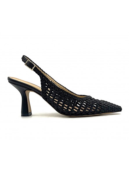Escarpin découpé Nacrée Yola tressé noir . Tendance et aéré l'escarpin Yola est particulièrement confortable grâce à son empeigne en tressée très souple . Découpé au talon , il est parfait pour l'été et la demi saison .