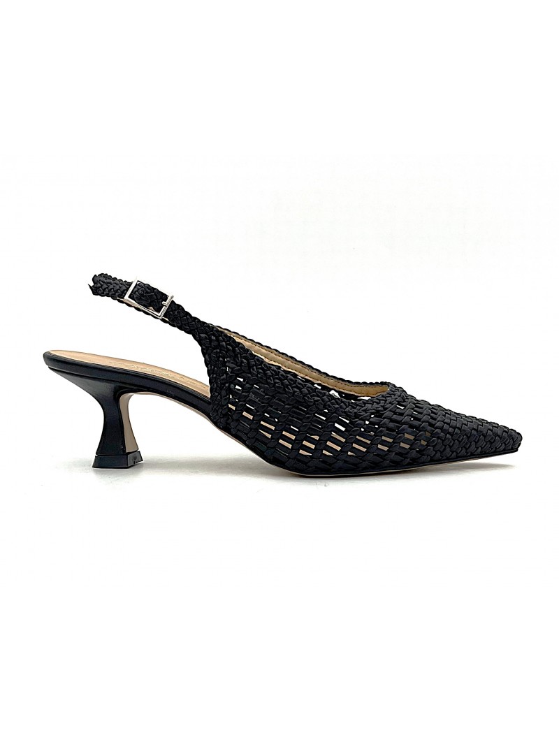 Escarpin découpé Nacrée Yza tressé noir . Tendance et aéré l'escarpin Yza est particulièrement confortable grâce à son empeigne en tressée très souple et son petit talon de 5 centimètres . Découpé au talon , il est parfait pour l'été et la demi saison .