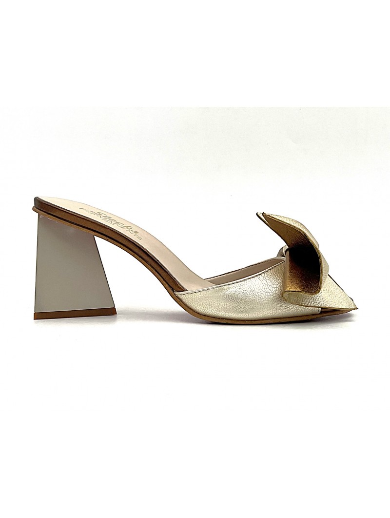Mule Stocks Permanents Rackel en cuir lamé or . Originale et élégante avec son joli nœud vernis et son talon de 7,5 centimètres .
