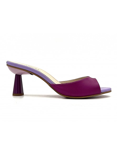 Mule Stocks Permanents Sidel en cuir aubergine et lilas . Simple et épurée , mais originale avec son joli talon de 6 centimètres .