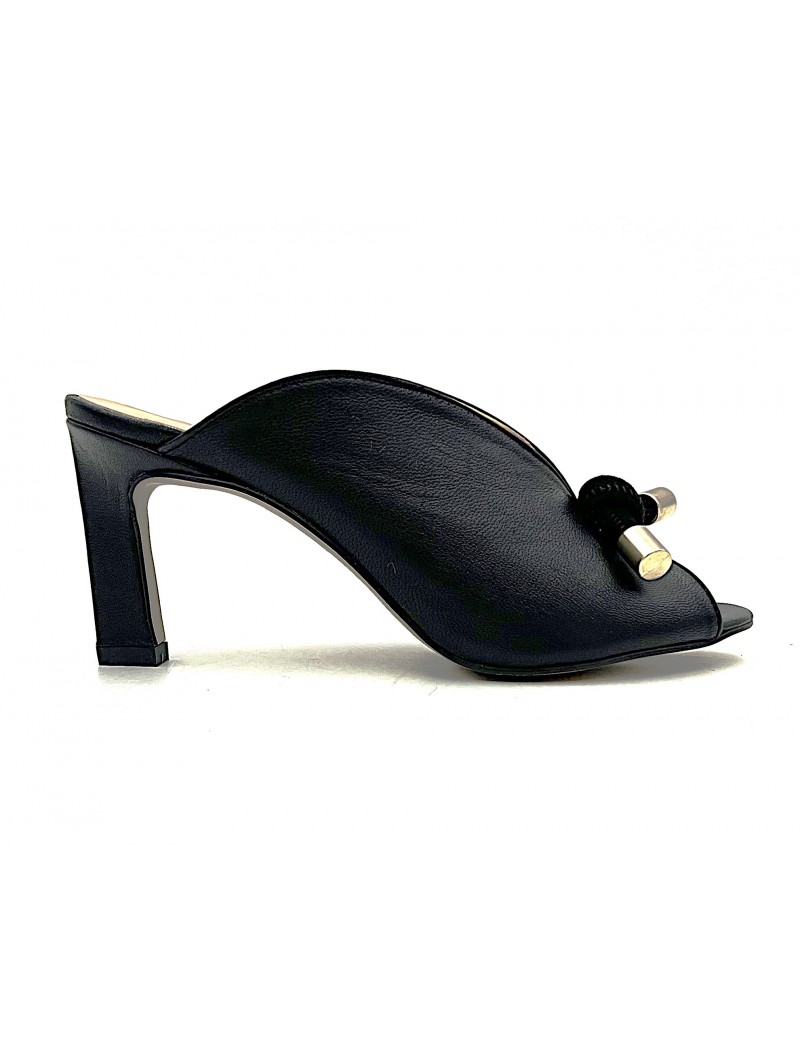 Mule Stocks Permanents Vanna en cuir noir . Confortable avec son talon carré . elle chausse parfaitement tout les pieds grâce a son empeigne emboitante .