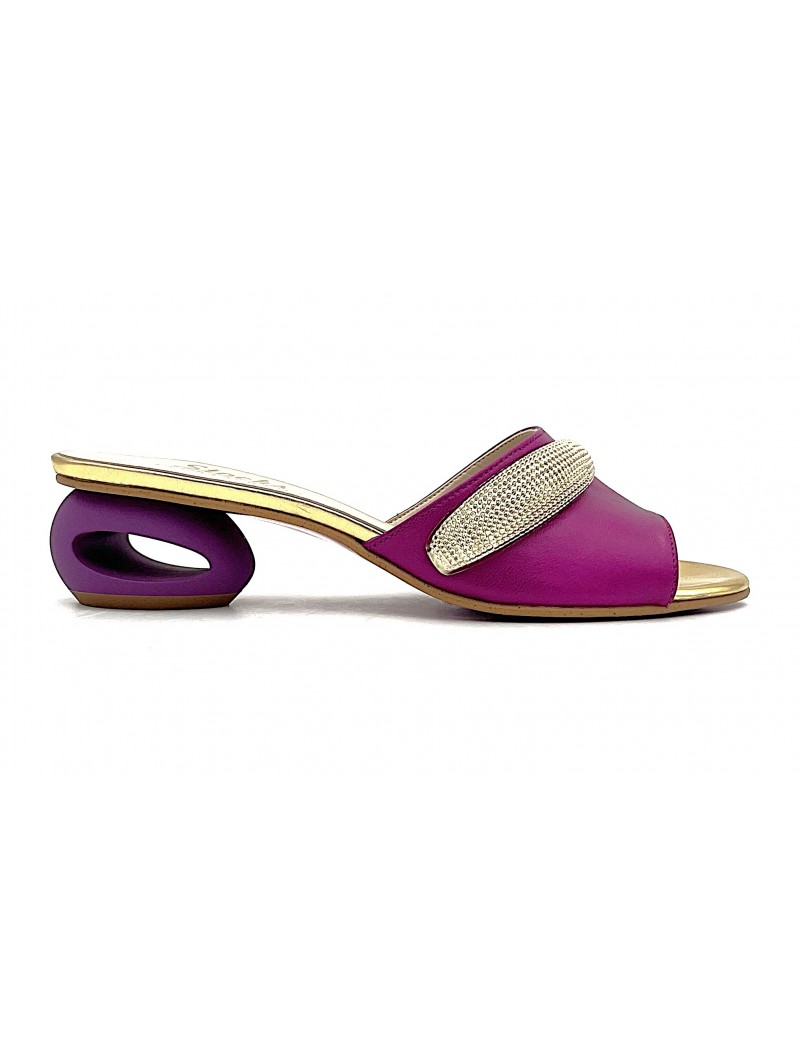 Mule Stocks Permanents Vidya en cuir aubergine . Très originale et tendance avec son talon galet troué .